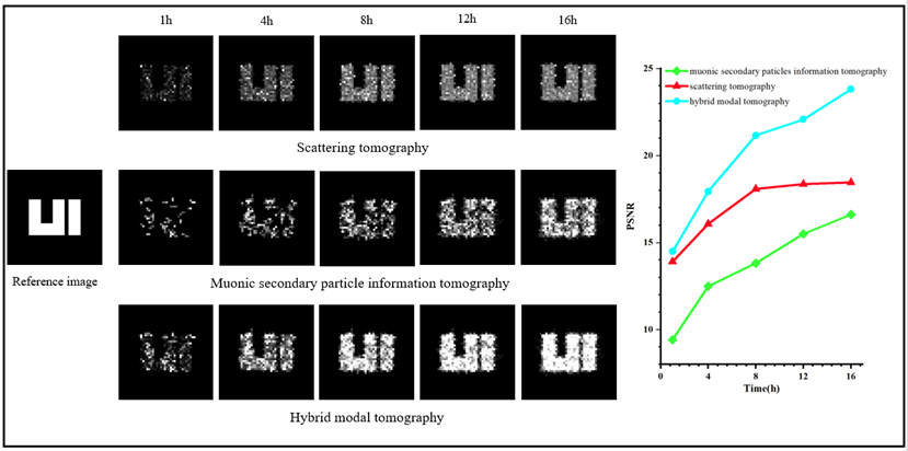 3)该成果完成了缪散射成像技术和径迹成像技术的混合成像,较好解决了径迹密度成像技术因次级粒子在物体内自吸收效应导致成像出现中空现象,同时弥补了散射成像技术无法对低Z材料进行成像的缺陷,提高了重建物质图像的识别度。结果如图3所示。并引入了峰值信噪比PSNR参数,量化计算了重建图像与参考图像之间像素误差来衡量图像质量好坏,结果如图4所示。