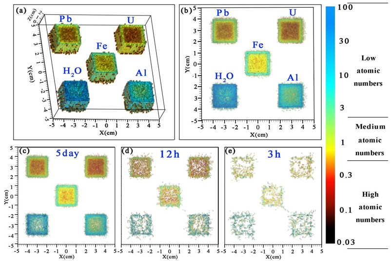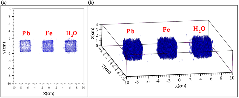 1) 新提出了一种符合径迹密度成像技术,在蒙特卡罗模拟层面进行充分的验证,实现了物质的四维成像,从模拟层面给出了次级电子和伽马射线对成像的贡献;在模拟层面利用符合事件的缪子径迹完成了五种2厘米见方物体的三维成像,利用次级粒子的信息完成物质在Z维度的分辨,从模拟角度对缪子次级粒子伽马和电子进行量化区分,利用伽马和电子的比值对物体进行Z维度的鉴别,与空间的三维成像叠加即形成探测物体的四维成像,如图1所示。初步验证了缪子及其次级粒子符合成像技术的可行性,成果把当前缪子成像应用范畴的边界扩展到了厘米级和低Z物质。