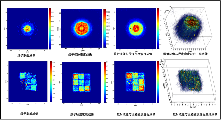 图3 散射技术、径迹密度成像技术以及两种混合成像技术效果对比,及混合成像三维图像