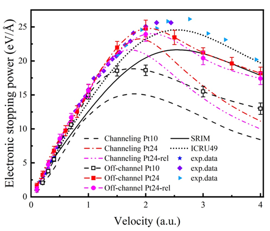 毛飞教授团队采用第一性原理分子动力学研究了载能质子在金属铂中电子能损的微观物理机制,揭示了铂中4f电子激发的微观机制及其对电子能损的贡献,同时也阐明了4f电子的相对论效应对电子阻止的影响。他们发现即使在低能离子辐照条件下,铂的内层电子也是可以被激发的。传统的电子能损理论认为低能电子阻止主要来源于费米能级附近的导带电子激发,因此该工作超越了传统电子理论的范式,并与目前的实验测量结果相符。该工作的开展使得人们对离子电子能损理论的认识更进了一步。论文的部分结果如图1所示。