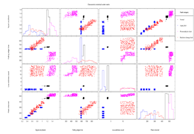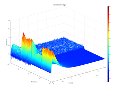图(a)特征提取;图(b)波形仿真;(c)信号特性统计图;(d)光电倍增管故障