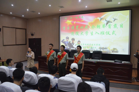 仪式开始,三名退役大学生在马军老师的介绍下身着军队制式夏常服,肩挂“光荣退伍”红底金字绶带,气宇轩昂的进入会场;全体师生面带微笑,场面分外温馨和谐。马军老师致辞热烈欢迎三名退役学生重返校园,介绍了他们在部队的经历和获得的荣誉。随着在场学生的热烈掌声,三名退役学生依次向全体师生敬礼回敬并就坐。