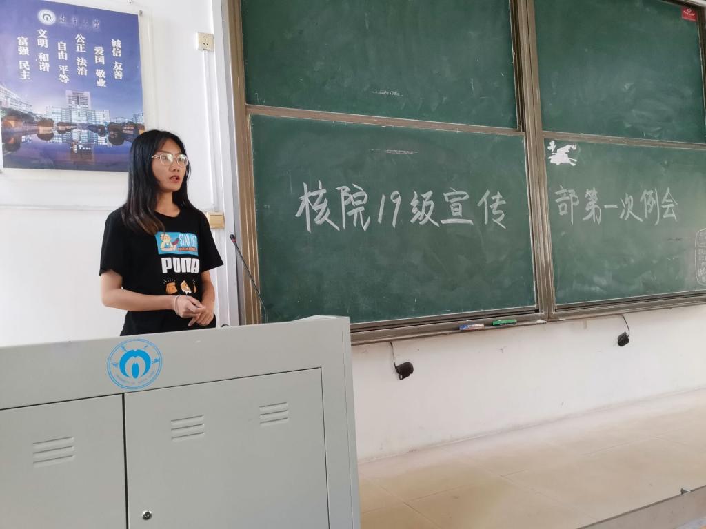 会议伊始,唐晨珂以简短的自我介绍作为开场,并对19届的新生干事们表示热烈欢迎,她指出宣传部是一个大家庭,希望大家能在工作中锻炼能力,在相处中收获友谊。随即,在各新生与18级负责人进行自我介绍后,副部长陈张铭对宣传部的主要职能与工作任务做出了详实的阐述。她表示,宣传部是36365线路检测中心团委学生会的重要职能部门,是各部门对内外组织与开展活动的窗口,关系到整个核院的形象面貌,希望各位干事以一丝不苟的精神与认真严谨的态度对待宣传工作。